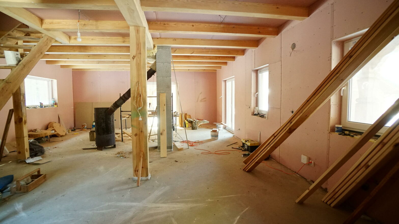Dom pochodzi z 2020 r. i jest w stanie deweloperskim. Wszystkie instalacje tj. elektryczna, hydrauliczna, grzewcza i wentylacyjna są rozprowadzone. Na parterze znajduje się ogrzewanie podłogowe, a na górę jest wyprowadzenie na grzejniki. Zbudowany jest grubej deski konstrukcyjnej (3,2cm), wzmacnianej balem drewnianym. Ocieplenie wewnątrz ścian stanowi wełna mineralna o grubości aż 25 cm. W połączeniu z grubą deską elewacyjną (3,2cm) daje bardzo dobry komfort termiczny, nie straszne mu najcięższe mrozy. Dach pokryty jest blachodachówką. W całym domu wstawione są okna 3-szybowe. Poddasze również ocieplone jest wełną, a pod posadzką podłogi znajduje się styropian.